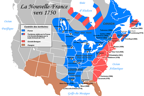 青:フランス、赤:イギリス、黄;スペインそれから 18 世紀北米の、フランス領とイギリス領の分布図などなどです。左の図では、青がフランス領、赤がイギリス領です。アカディアンの人たちは、イギリスに敗れて、フランス領のルイジアナまで、とても長い距離を南下してやってきたのですね。ちなみにルイジアナはルイ 14 世をたたえてつけられた地名とか Cette région ... s'appelle Louisiane en hommage à Louis XIV 。