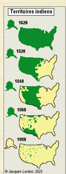 今回は少々、地図やら絵画をのぞいてみました。たとえば、ネイティブ・アメリカンが住んでいた地域 Territoires indiens の図 ( 17 世紀以降、戦いや法律でつぎつぎと土地を奪われていった様子が分かります ネ … ) 。