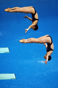 愉快なことに、ノッポとチビのペアもいましたが、両者、見事にシンクロしていました。究極のペアはすらりとした三つ編みの二人の中国の選手でした。飛び込み台に立つ二人の姿に観衆は息をのみます。そして優雅に勢いをつけた二人が、中空に身体を放ちます。まずは最初の数千分の 1 秒。完璧です Après quelqeus impulsions gracieuses, elles ont sauté. Les premières microsecondes, c'était parfait 。